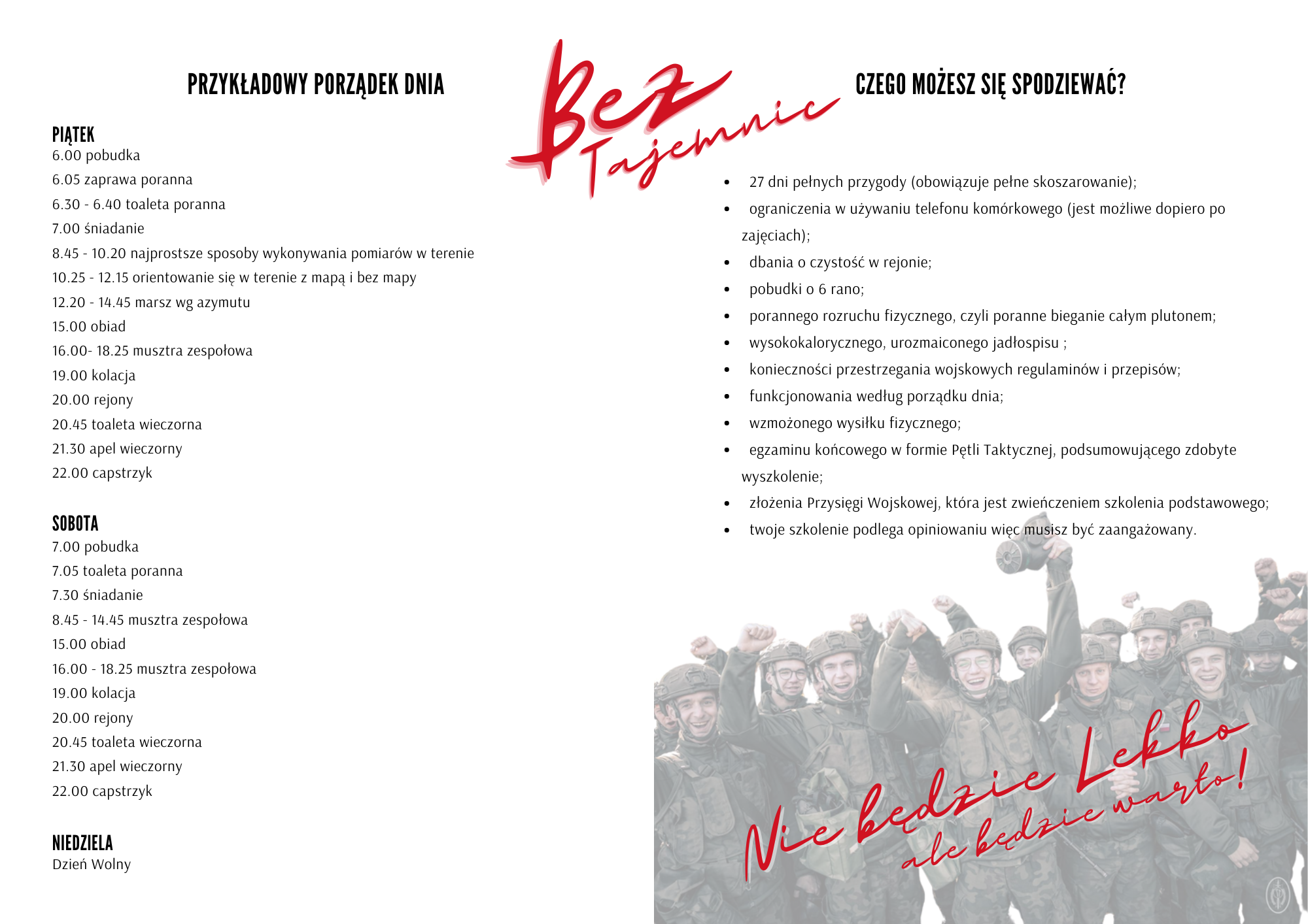 Wojsko Polskie umożliwia pełnienie zaszczytnej służby Ojczyźnie, która daje szansę rozwoju zawodowego oraz sprawdzenia się. Ministerstwo Obrony Narodowej realizuje cyklicznie szereg programów szkoleniowych i edukacyjnych mających na celu zwiększenie zainteresowania służbą wojskową. To programy, które dają szanse przeszkolenia różnym grupom wiekowym obywateli. Celem powyższych szkoleń oraz projektów edukacyjnych MON jest budowa odporności obywateli i całego Państwa na możliwe zagrożenia, wzmocnienie bezpieczeństwa Polski i jej mieszkańców. To odpowiedź na rosnące wyzwania dotyczące bezpieczeństwa i potrzeby budowania odporności państwa.