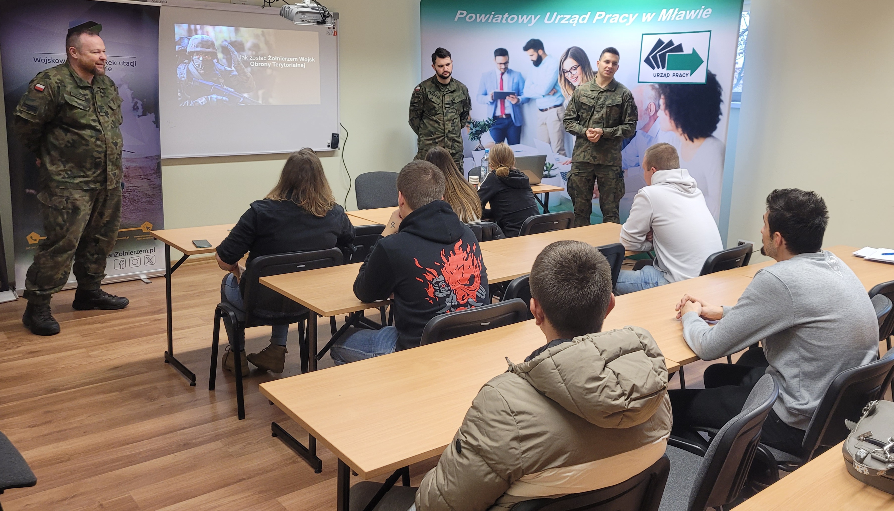 W dniu 20.11 br. w siedzibie naszego urzędu  odbyło się kolejne spotkanie przedstawicielami Wojskowego Centrum Rekrutacji w Ciechanowie oraz 5 Mazowieckiej Brygady Obrony Terytorialnej. Oprócz omówienia wszystkich kwestii rekrutacyjnych prelegenci poruszyli takie tematy jak Dobrowolna Zasadnicza Służba Wojskowa, Terytorialna Służba Wojskowa czy Szkolnictwo Wojskowe. W tym samym dniu odbyło się spotkanie z przedstawicielem Komendy Powiatowej Policji w Mławie. Uczestnicy mieli możliwość dowiedzieć się, jak wygląda praca policjanta oraz jak przebiega proces rekrutacyjny. Zostały  zaprezentowane również filmiki pokazujące różną specyfikę pracy w tym zawodzie.