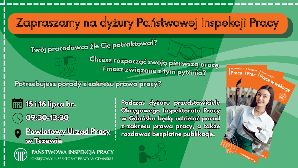 Już 15 i 16 lipca 2025 r. w godzinach 9:30–13:30 w siedzibie Powiatowego Urzędu Pracy w Tczewie odbędzie się dyżur Państwowej Inspekcji Pracy.To doskonała okazja, by bezpłatnie i bezpośrednio porozmawiać z inspektorem pracy i rozwiać swoje wątpliwości!